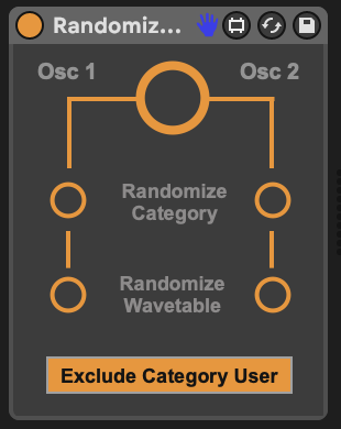 | Description: | Drag in front of a Wavetable-Device to randomize Wavetable Categories and Wavetables. 1.2.3: Fixed a problem that sometimes would lead to a "stack overflow" message". 1.2.2: Exclude/include category "User" into Randomization 1.2: Now works in Instrument Racks and Drum Racks 1.1.1: Some minor changes and bugfixes 1.1: Added option to randomize both Oscillators with one click. Added auto-detect wavetable device. |