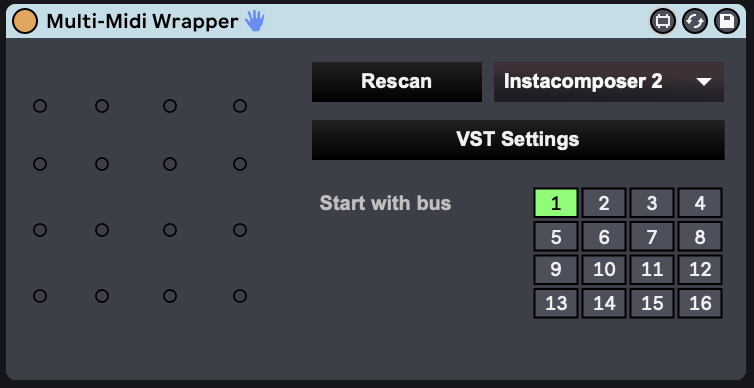 | Description: | This was called "Instacomposer Wrapper" because it's the biggest use case I have on hand, but it will generally let you work around the goofy lack of MIDI channel routing in Live. Pick a "base" bus number, and then put a MIDI receiver before each instrument. (e.g. "start with bus 1" and then "receive 1", "receive 2", etc, up to "receive 16"). Several Max4Live devices use the same protocol by default, and the UI in this one is based somewhat on one called "Max MIDI Receive" and "Max MIDI Sender". You will also need a MIDI receiver device that accepts the standard-ish "M4L.MidiBus-%i" messages. Originally I was directing people here: https://www.ableton.com/en/packs/max-7-pitch-and-time-machines/ But since that only supports 12 channels, I've built an updated device that does all 16: https://maxforlive.com/library/device.php?id=9451 This device is a revamp/rework of my earlier version. I decided to leave that as a separate entry in case the older one was working better for someone. https://maxforlive.com/library/device/7990/instacomposer-wrapper Since that one, I've added support for all 16 channels, and it's also capable of saving its state properly for presets and such. I'd like to make a short tutorial about this some time, but it's not ready yet. Changes since 2.0: * Pipes through input MIDI to the selected VST |