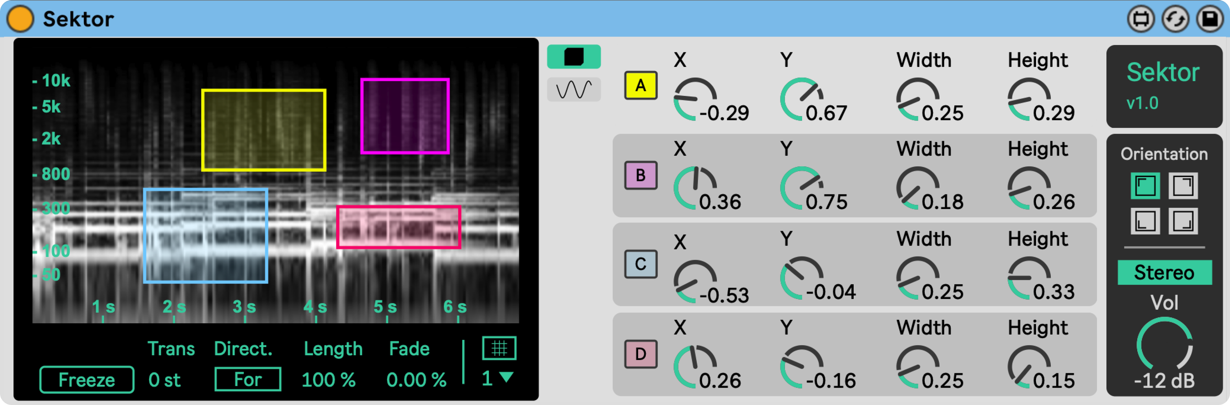 | Description: | Sektor is an Max for Live insert effect for Ableton Live that uses an FFT-based frequency gate to split the incoming audio signal into up to four frequency bands. Each of the signals can be routed to individual channels in Ableton Live, where the sound can then be further shaped with effects. Further, looping and sampling functions are available to the user, allowing for in-depth audio editing and manipulation. On the scrolling spectrogram the user can draw rectangles defining frequency range and time range. This is a very accessible way to apply the sound characteristics of FFT filtering to an incoming audio signal. The powerful internal modulation system allows the size and position of the rectangles to be modulated with a wide variety of waveforms, creating exciting and unexpected sonic results. Requires at least Ableton Live 10, however Live 11 is recommended. https://www.youtube.com/watch?v=eEEuZMVexVU |