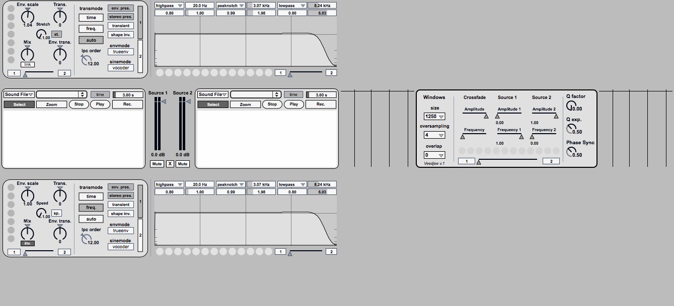 | Description: | This device is a powerfull advanced phase vocoder with FX modules. It require the following Ircam's external objects: supervp.trans~ supervp.play~ supervp.cross~ Choose between three different modes for both sources and mix them to create the resultant cross synthesis. -Use audio from an audio track, or grab it in a buffer to stretch it, or you can drop Soundfile file directly in the device. -Tweak and stretch the source through the FX and EQ modules before doing the synthesis. -Many presets options available. Quick demo here: http://soundcloud.com/veedjee/xsynth-demo1 http://soundcloud.com/veedjee/xsynth-demo2 Hope you will like it ! Suggestions & comments much appreciated !! Check my other devices here: http://www.maxforlive.com/library/index.php?by=any&q=veedjee&submit=Search v1.0.1 -morphing preset for dsp and filter module will work correctly now -stretch and speed buttons now act on each other -fix names of all objects explicitly for automation in Live -add help annotations v1.0.2 -filters are now effective |