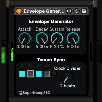 | Description: | The Envelope Generator designed for Ableton Live, crafted to synch with your project's tempo and add a rhythmic dynamic shaping to your sounds. With control over attack, decay, sustain, and release parameters, The envelope generator can act as a sidechain compressor that allows you to create intricate rhythmic patterns and evolving textures that seamlessly integrate into Ableton. If you like my work and wish to collaborate or contact me, the best place to do so is through my instagram @supertramp162. https://linktr.ee/supertramp162 |