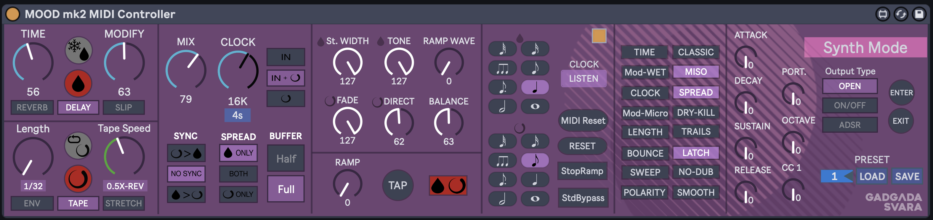 | Description: | This is a Max for Live Device to MIDI control the Chase Bliss MOOD MK2 Pedal. I put all the MIDI control from the manual into this device. Basically you can control any of the parameters, automate it inside Ableton Live, sync to external/Ableton Live's clock, and save and recall up to 122 presets. |