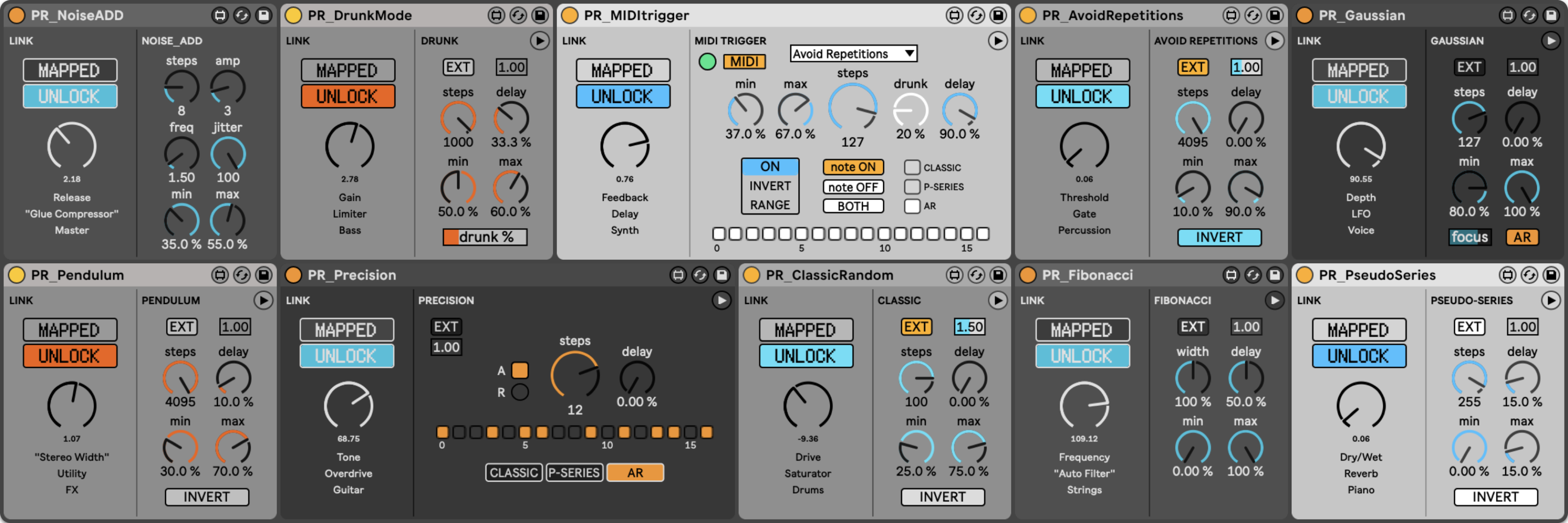 | Description: | Parameter Randomizer Suite is a collection of ten Max for Live plugins designed to send customizable random data to Ableton Live parameters. |