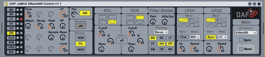 | Description: | The DAF JoMoX XBase999 Control uses CC messages to control the drum synth parameters in real time. Works with the 888 too (thanks danhill). New in 1.1: * improved automation * FCL and FCR fixed * SD Decay fixed Thanks to Delaney Parker for the inspiring FM JoMoX AiR Base 99 Control 0.6 |