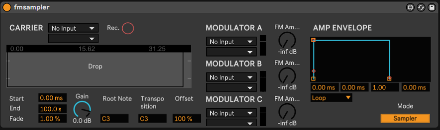 | Description: | FMsampler is made for sample-based FM synthesis. It attempts to expand on Ableton's stock sampler's "Oscillator" feature, which allows the user to modulate the pitch of a sample at audio rate. With FMsampler, any signal can be used to modulate the pitch of a sample, not just simple waveforms generated by oscillators. Additionally, up to three signals can be used to modulate the sample simultaneously - not just one oscillator, as in Ableton's sampler. It also features a Looper mode, in which the sample is constantly looping instead of being triggered by MIDI input. Currently the sampler is monophonic. |