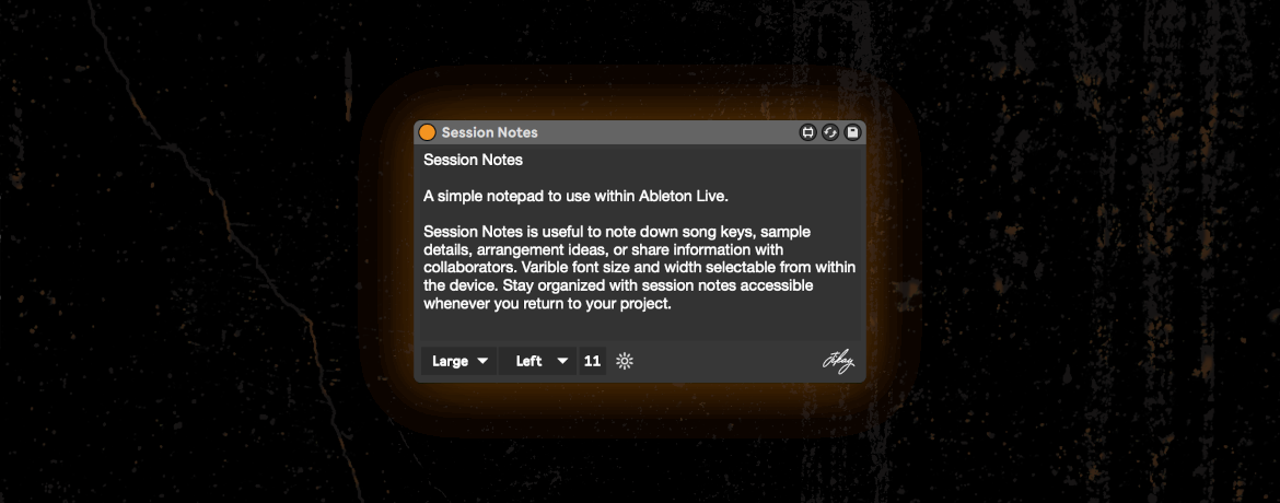 | Description: | Session Notes A simple notepad to use within Ableton Live. Session Notes is useful for noting down song keys, sample details, arrangement ideas, or sharing information with collaborators. Font size and width are selectable from within the device. Stay organized with session notes accessible whenever you return to your project. Free download. Updates: v1.2 features a refined UI and 'light mode' for those using lighter themes in Ableton. |