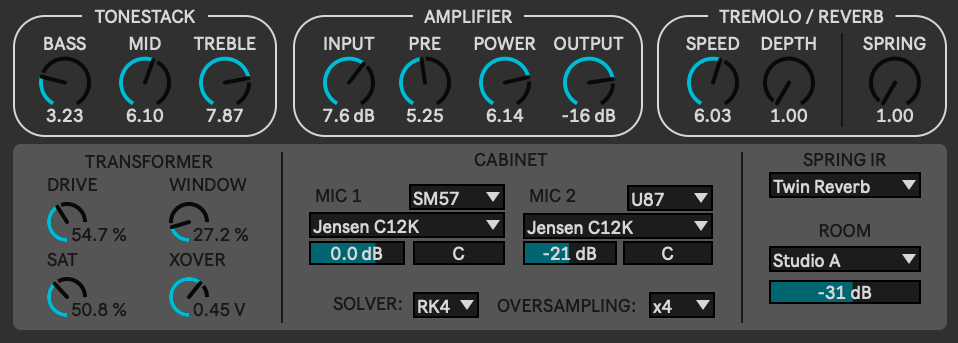 My suggested workflow is dialling in the EQ first, as it can dramatically shift the overall input levels (on the real amp, the EQ was also before the preamp stage, with only a single tube buffer before it). The INPUT control can add some makeup gain if needed, and be used to drive the preamplifier. The PRE control is more-or-less level compensated, so adjusting it primarily just adjusts the distortion. The power amp follows the tremolo and spring reverb the signal chain, but I thought it made more sense to keep it together with the preamp. The POWER control drives the input to the power amp section, and the OUTPUT control can attenuate the overall amp level prior to the cabinet convolution. There isn't a dedicated gain control to adjust the level between the power amplifier output and the transformer, so it is dependant on how hard the power amplifier is being driven. The hysteresis model does include a DRIVE parameter as well, so you will should get some milage out of that if you find the hysteresis is too heavy.