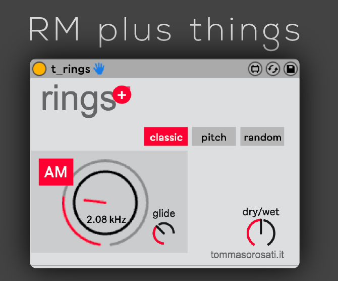 | Description: | Rings is a Ring Modulation effect plus something else. VIDEO DEMO: https://youtu.be/ITqg0pogrmE It can act as both RM and AM and has three modes: - classic: no surprises - pitch: estimates the input note and sets the modulating frequency to integer multiples of that note - random: creates a random modulating frequency for each input note within a range you can choose In addition, it has a transition time control between one frequency and the next (glide). VIDEO DEMO: https://youtu.be/ITqg0pogrmE |