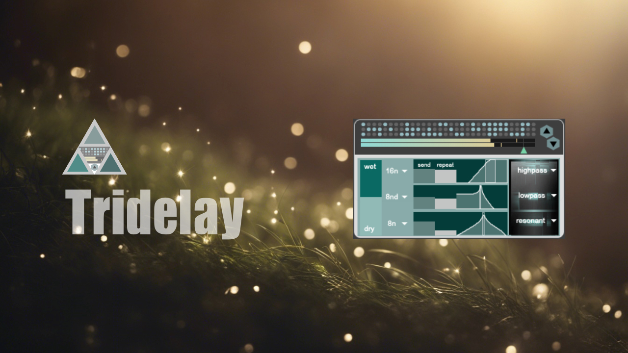 | Description: | Free The Tridelay allows you to specify the send level to three tempo-synced delays randomly, toggling them on or off every 8th note. Each delay can be configured with settings such as delay time (16n, 8nd, 8n, 4n), send level, repeat, and filter. |