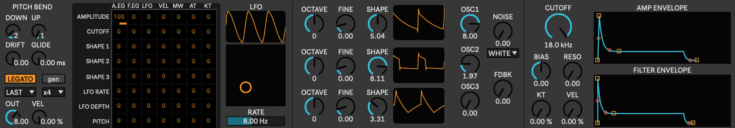 | Description: | Model D MiniMoog mono synthesizer. I wrote a custom C++ external and research paper for the Transistor Ladder Filter model. Much more details about that and the features on the URL (KoFi). Free/Donationware :) |