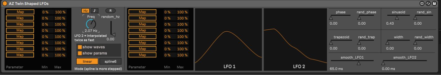 This LFO can produce a variety of shapes, from steps to curves to any combination thereof. The second LFO is interpolated at twice the speed of the first, so therefore produces shapes at twice the rate. It won't exactly reproduce the shape at twice the speed, but it will create more curves or steps, but always in relation to the first. The spline-6 offers an interpolation with a shift-register at 6 different points on the curve, so the shapes and steps will be a bit shallower. Each LFO can be individually smoothed. Portions of this device are based on gen~ patching found in "Generating Sound and organizing Time" (https://cycling74.com/books/go) copyright Gregory Taylor and Graham Wakefield. Ableton 10 or higher. |