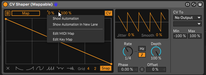| Description: | CV Shaper, except the Min and Max ranges for each mapped parameter are themselves automatable and mappable. I'll probably update or do similar for Live 12 modulators if needed. Feel free to offer feedback, suggestions, or ideas. Changelog: 1.1: - Added Y Grid Line Control - Increased range of X and Y grid lines - Snap works for both axes 1.2: - Bugfixes - Independent X and Y snap |