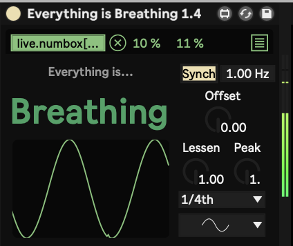 | Description: | This device syncs with the tempo of your Ableton 11 project so you can tie automation to it. Imagine a stock device like the 'LFO tool', but instead the automation linked to this device will sync with the tempo. So the automations crest and trough will land at the same spot on the grid every time. Change or automate the tempo and it will still match to the exact beats of the project— basically it will ALWAYS be in sync with the grid of your project so you can map the parameters you want and they will land in predictable places every time. Update: Made a 'de-sync' from global tempo option so you can even automate the BPM. |