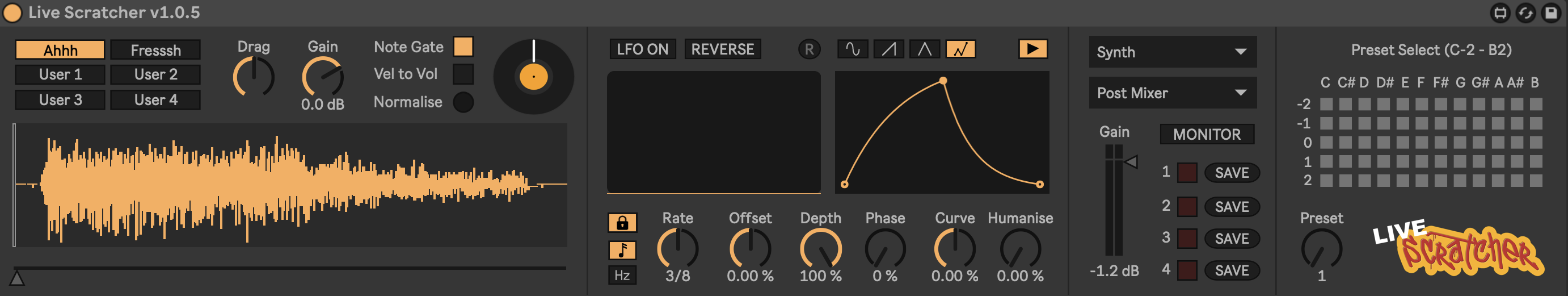 Description: Emulates a DJ scratching sound by moving a playhead over a sample. You can control the playhead using Ableton’s automation, an external MIDI controller, or the built-in LFO. Use a MIDI note to ‘cut’ the sound in and out.