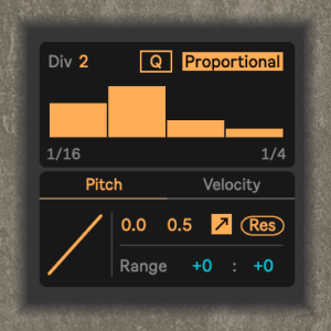 Segment is basically a combination of Divs and Condition Transform. The histogram section at the top, borrowed from Condition Transform, displays the notes in the clip according to their duration. You can select notes by picking specific durations, and then subdivide them with the velocity and pitch functions borrowed from Divs. Quantization and special Division Mode help tame this device's weirdness when you need that. |