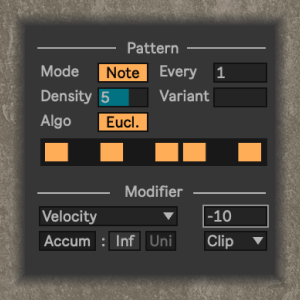 | Description: | Pattern Transform is a multi-function MIDI clip manipulator that is fantastic for creating variations on your ideas. It is probably the most powerful of all of my MIDI Tools. Want to take a beat but just thin it out by removing some of the notes? Or increase the freneticity of the beat by adding more notes? Or create some controlled melodic variation (in key, of course) within the course of a bassline. This device can do all of that, and more. It has two sections: the first is a pattern generator that creates a mask on top of your MIDI clip. The second is a note modifier that transforms the notes that fall within the "windows" in the mask. Check the video below for more info. |