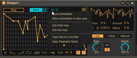| Description: | This is Live 12's Shaper except: - All Modulation parameters (mod amt, control min and max) are mappable/automatable - X and Y both have grid line control - X and Y have independent snap control - Grid line maximum is pretty high, combined with the snapping allows for precision |