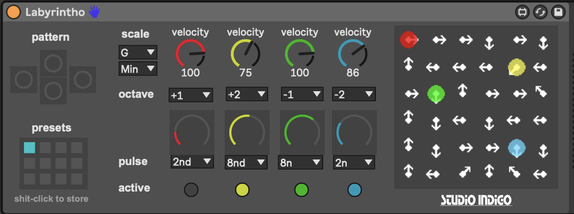| Description: | This is an homage to an old Nintendo music game called Electroplankton. There was a part where you could use arrows to set a path for 1 to 4 notes. I had so much fun with this that I made it a Max for Live object. I hope others enjoy it too! |