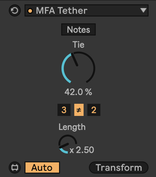 | Description: | A very simple transformer to probabilistically extend notes by a length multiplier to induce occasional legato ties within a selected string of notes. MIDI TRANSFORMER TOOL FOR LIVE 12 INCLUDED WITH MIDI TOOLSET 001 MIDI Tools are an innovative new category of creative devices available in Live 12. Designed by Ableton Certified Trainer Noah Pred to accelerate workflow, enhance creativity, and access new musical ideas, our inaugural MIDI Toolset includes four MIDI Generators and eight MIDI Transformers. Harness the power of seven different randomization algorithms to generate compelling new melodies and chords with Metaflux, take polyrhythmic expression to the limit with Metarhythm, intuitively draw complex gestures with Metasketch, and carve new melodic contours with Metapath. Then take things further and transform your MIDI by imposing unique rhythmic patterning on existing sequences with Euclidifier, adding dramatic variations with Fluctuator or more subtle changes with Inebriator, harness note activation to rapidly generate pattern variations with Mutator, use Octavator for randomized transpositions by octave, use Swinger for randomized per-note shuffle timing, Tether to randomly add note ties, or apply Tilter to adjust chance, velocity, and length on a key-scaled, pitch-relative basis. All MIDI Tools are scale aware and Info View annotated to seamlessly enhance your creative experience. New in version 1.1: Toggle to determine whether notes are processed individually, or whether chords are processed together with the same settings New in version 1.2: Count options Finer length increments Version: 1.2 Requires: Ableton Live 12.x running Max for Live 8.6.x on Mac or PC. Includes: Metaflux, Metarhythm, Metapath, and Metasketch MIDI Tool Generators; Euclidifier, Fluctuator, Inebriator, Mutator, Octavator, Swinger, Tether, and Tilter MIDI Tool Transformers; Utility Boost, user guide. |