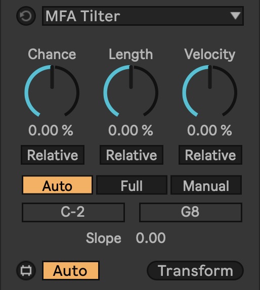 | Description: | Adjust note chance, length, and velocity relative to their pitch: for example, give low notes higher velocities and longer lengths while making higher notes less probable. Relative mode uses current parameter values as a base, while fixed calculates them purely based on their actual pitch. Auto calculates note pitches based on the current range of notes, full assumes the entire keyboard should be accounted for in calculations, while manual allows you to specify a range with the note sliders at bottom. MIDI TRANSFORMER TOOL FOR LIVE 12 INCLUDED WITH MIDI TOOLSET 001 MIDI Tools are an innovative new category of creative devices available in Live 12. Designed by Ableton Certified Trainer Noah Pred to accelerate workflow, enhance creativity, and access new musical ideas, our inaugural MIDI Toolset includes four MIDI Generators and eight MIDI Transformers. Harness the power of seven different randomization algorithms to generate compelling new melodies and chords with Metaflux, take polyrhythmic expression to the limit with Metarhythm, intuitively draw complex gestures with Metasketch, and carve new melodic contours with Metapath. Then take things further and transform your MIDI by imposing unique rhythmic patterning on existing sequences with Euclidifier, adding dramatic variations with Fluctuator or more subtle changes with Inebriator, harness note activation to rapidly generate pattern variations with Mutator, use Octavator for randomized transpositions by octave, use Swinger for randomized per-note shuffle timing, Tether to randomly add note ties, or apply Tilter to adjust chance, velocity, and length on a key-scaled, pitch-relative basis. All MIDI Tools are scale aware and Info View annotated to seamlessly enhance your creative experience. New in version 1.1: · New scaling Slope control Version: 1.1 Requires: Ableton Live 12.x running Max for Live 8.6.x on Mac or PC. Includes: Metaflux, Metarhythm, Metapath, and Metasketch MIDI Tool Generators; Euclidifier, Fluctuator, Inebriator, Mutator, Octavator, Swinger, Tether, and Tilter MIDI Tool Transformers; Utility Boost, user guide. |