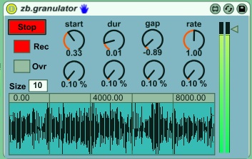 This granulation device will allow to record or overdub an audio buffer that you can granulate. The available parameters are start position, grain duration, gep between grains and the playback rate. Each of these parameters has a variation control beneath. |