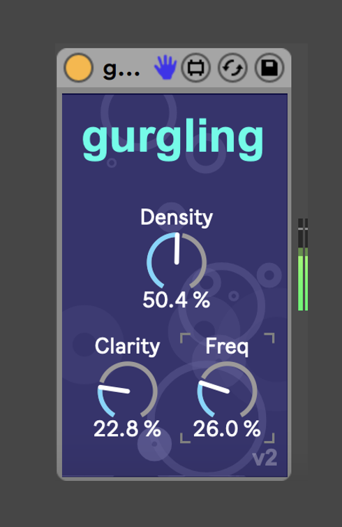 | Description: | movie1: https://www.youtube.com/watch?v=rc9s7iNuYE8&ab_channel=tsugumasa320 movie2: https://www.youtube.com/watch?v=pMrgD-Ltna0&ab_channel=tsugumasa320 - Abstract The "gurgling" sound is a strange one, similar to the bubbling noise of water. The density, clarity, and frequency of this sound can be adjusted. - Parameter Visualization The background bubbles are linked to the parameters of the device. Increasing the "density" setting makes the bubbles more numerous, while the "clarity" setting makes them more defined. Adjusting the "frequency" setting causes the bubbles to flow faster. I am developing various other devices. Check them out if you like. https://tsugumasa320.gumroad.com |