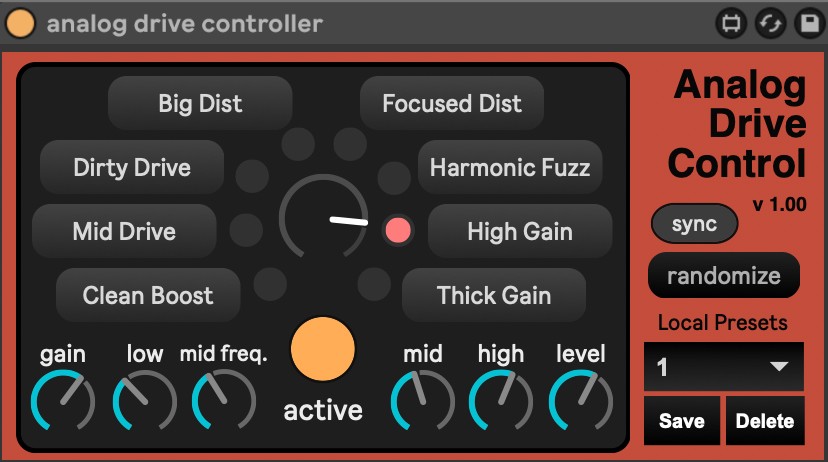 | Description: | Analog Drive Control is a MIDI controller for the Elektron Analog Drive multi-circuit distortion pedal. This plugin enables easy access and saving of all of the pedal's parameters, as well as live knob adjustment via Ableton's automation lanes and modulator devices (e.g., LFO, envelope follower, etc.). If you find the plugin useful, please consider donating a coffee at ko-fi.com/alteredsignal Tested working on Ableton Live 11 and 12. To use, drop the Analog Drive Control device into a new MIDI track in Ableton. Set the track's MIDI channel to match that of the input channel of the Analog Drive pedal (see page 15 of the Analog Drive manual to set the input MIDI channel). Connect a MIDI cable to the input of the Analog Drive and to the MIDI output of your audio interface. Test the connection by adjusting the Circuit Selector knob on the plugin - the corresponding LED should light up on the pedal. Happy tweaking! |