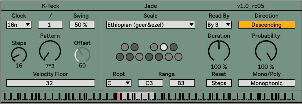 | Description: | JADE BY K-TECK Jade uses Interference Patterns (combinations of 2 or 3 regular triggers) to conjure up 128 rhythm patterns. You (yes, you) select sections of these patterns so that Jade can use K-Teck’s unique note generation engine to create stunning melodies, bass parts, repeated riffs… whatever you like. And then… if you feel so inclined, you can activate Jade’s polyphonic shift registry for chords, arpeggios and stuff… Jade is simple to use but very powerful. Whether you love to use step sequencers or just turn to them for occasional inspiration, Jade can do it all… |