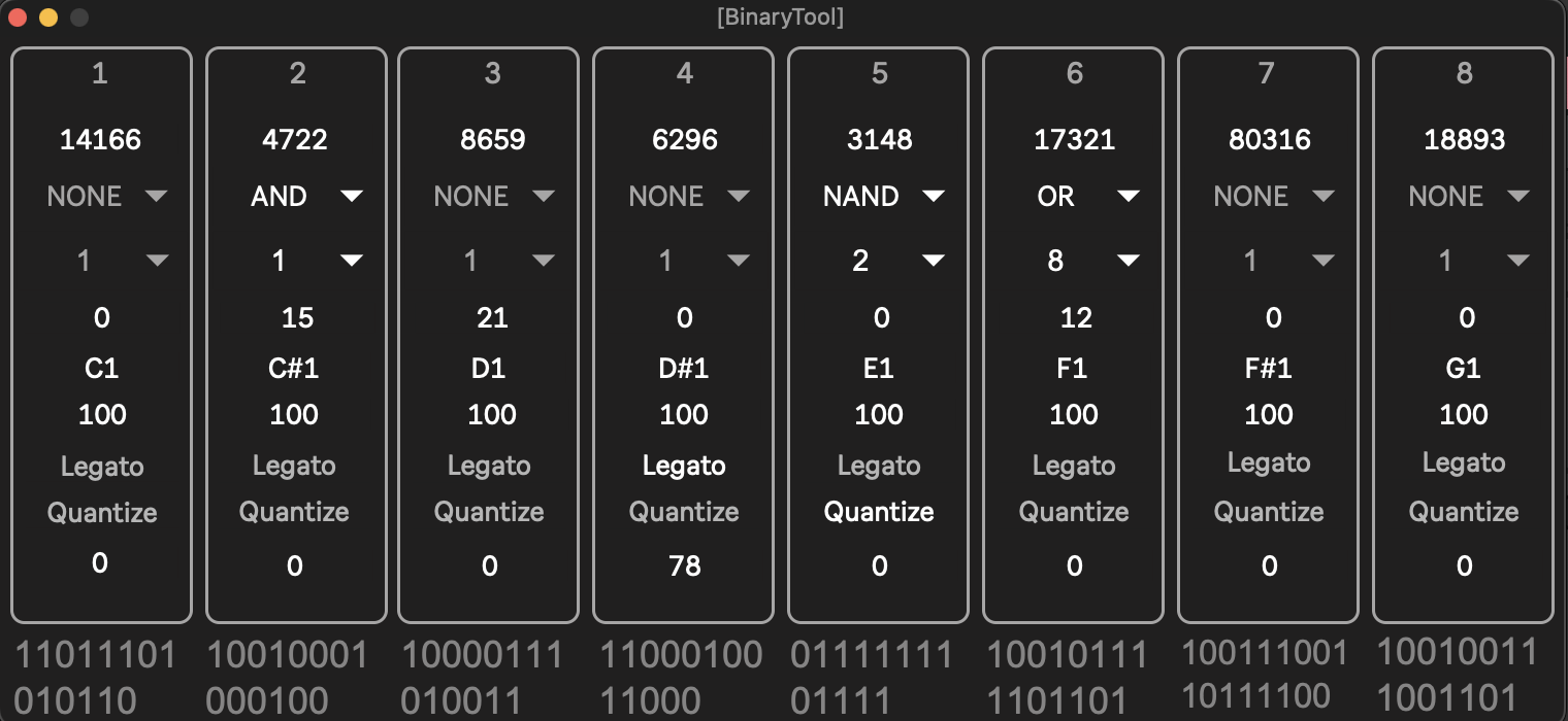| Description: | 2.2 Scale bug fix 2.1 Added UI scaling 2- completely rewritten in JS, made the tool into a popout ui using a binary number you can create a pattern for up to 8 pitches it has the ability to use logic operations between the "Lanes" on the binary pattern created not necessarily the notes created options to increase the size of the pattern to repeat and fill the clip and to make notes legato or quantized per Lane. at the bottom of each lane is a display showing the binary pattern, it can be useful to get an idea of how its working. 1.2 Bug fix. BinaryTool no longer outputs notes until a parameter has been changed. Previously it would add notes to a clip unexpectedly when selecting a clip after opening a project. 1.1- Note are wrapped around within the selected time range. Offset added, With offset selected the notes can be offset by a chosen amount. Made a MidiTool Generator based on an old Binary Sequencer I made following a video by Philip Meyer a few years ago. It outputs 4 Pitches with a random range for Velocity and Chance. Just Place it in your UserLibrary/MidiTools folder and it should show up under Generators. |