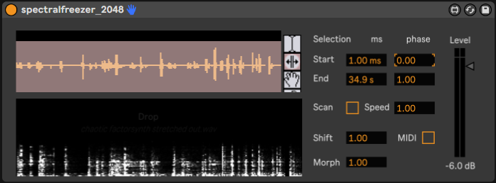 | Description: | This simple device uses a spectral buffer to play back a sample. It can be used for example to alter the playback speed of the sample without altering the pitch (time stretching) or to freeze the playback entirely at a chosen point of the sample. Additionally, the frequency content of the spectrum can be altered with the "morph" feature. Features / Controls: - Waveform display with controls to select a section of the sample & to zoom in and out. - Spectrum display. Samples are loaded into the device by dragging & dropping them onto this display (the bottom one). - Selection controls: start and end points for scanning can be selected either by phase (0-1) or time (in ms) - Scan: enabling scan plays back the sample in a loop, between the selected end and start points, at the selected speed. Alternatively, the sample can be played by mapping for example an envelope or LFO to the start phase parameter, which i myself have found to allow for better control. - Shift: shifts the pitch of the sample. By enabling MIDI, the pitch parameter can be controlled by MIDI input. - Morph: an effect that sounds somewhat like pitch-shifting, but weirder. Bugs / Deficits: - Loading the sample is slow - it takes as long as the duration of the loaded sample. The loading progress should be visible in the spectrum display. - Additionally, i have found that in some instances the sample does not load for unknown reasons. If this happens, replace the device and try again, or load another sample and then load the original one. - The FFT size is set to 2048 and can only be changed by editing the Max patch. I have made copies of the device with the FFT sizes 512, 1024 and 4096, which can be uploaded by request. - The instrument is monophonic. |