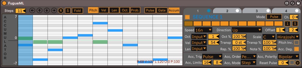 Description: | A Sequencer similar to the popular Fugue Machine Sequencer for Apple devices that does not have the fancy Piano roll with multiple play heads moving around, but with M4L's Step Sequencer. A few more additions not in the original like: - A pattern for each of the four Sequence - Additional directions (like Random, Drunk, Odd) - Start and End Offset for playing each of the Sequence - A toggle to repeat each note twice - Velocity, Length and Probability settings for each of the Sequence - Octave and Probability setting for each of the note in the Step Sequencer - Gate setting for ALL notes - Each note can be sent to a different Midi Channel or routed to a different Ableton Track like all my other devices - The power of Max for Live and Ableton to modulate/automate almost every control including changing presets! - V1.2 now has Metropolix like features - V1.3 now has built in Scales Check out the youtube video https://www.youtube.com/watch?v=QSjR7uXjyq8. 10/5/2024: Updated to v1.2 that now includes Metropolix like features 1/12/2025: v1.3 update now adds built-in scale for every Sequencer |