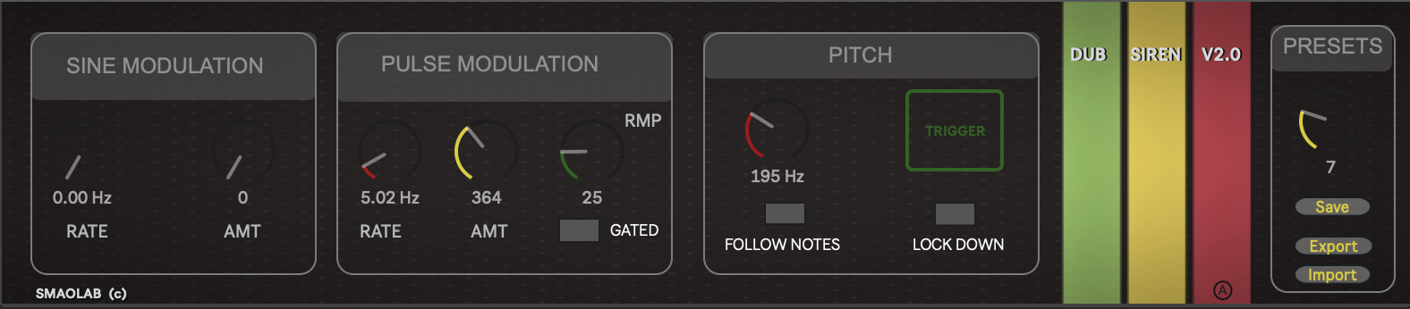| Description: | M4L Dub Siren V2.2 aims to create nice old school dubby siren sounds. It’s free & fully supported. -------------------------------------------------------------------- Key features Change the pitch (tone) of the siren, 12 pre-defined presets & 12 users presets, Save, export & import your own presests, PULSE & SINE modulations (LFOs), FIRE/FLAM function, Gate to create syncopatic /stutter sound, Follow midi inputs notes, No delay, no reverb, pure Dub Siren sound. ----- Version 2.2/ You can map parameters to any external hardware midi controller AND control the dub siren trigger with your MOUSE or KEYBOARD (it was not the case before) Version 2.1/ You can map parameters to any external hardware midi controller & bug in the presets has been fixed :-) Version 2.0: initial version (almost) ---- -- Enjoy !! |