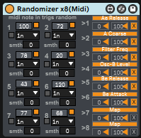 this is a randomizer with 8 mappers. you can randomize with a time sig based off the transport, or you can randomize via a midi note in, or audio threshold (audio version only). great for generative or experimental sound designs! comes in a midi/audio varaint. see and study the included example .also for usage/ideas.