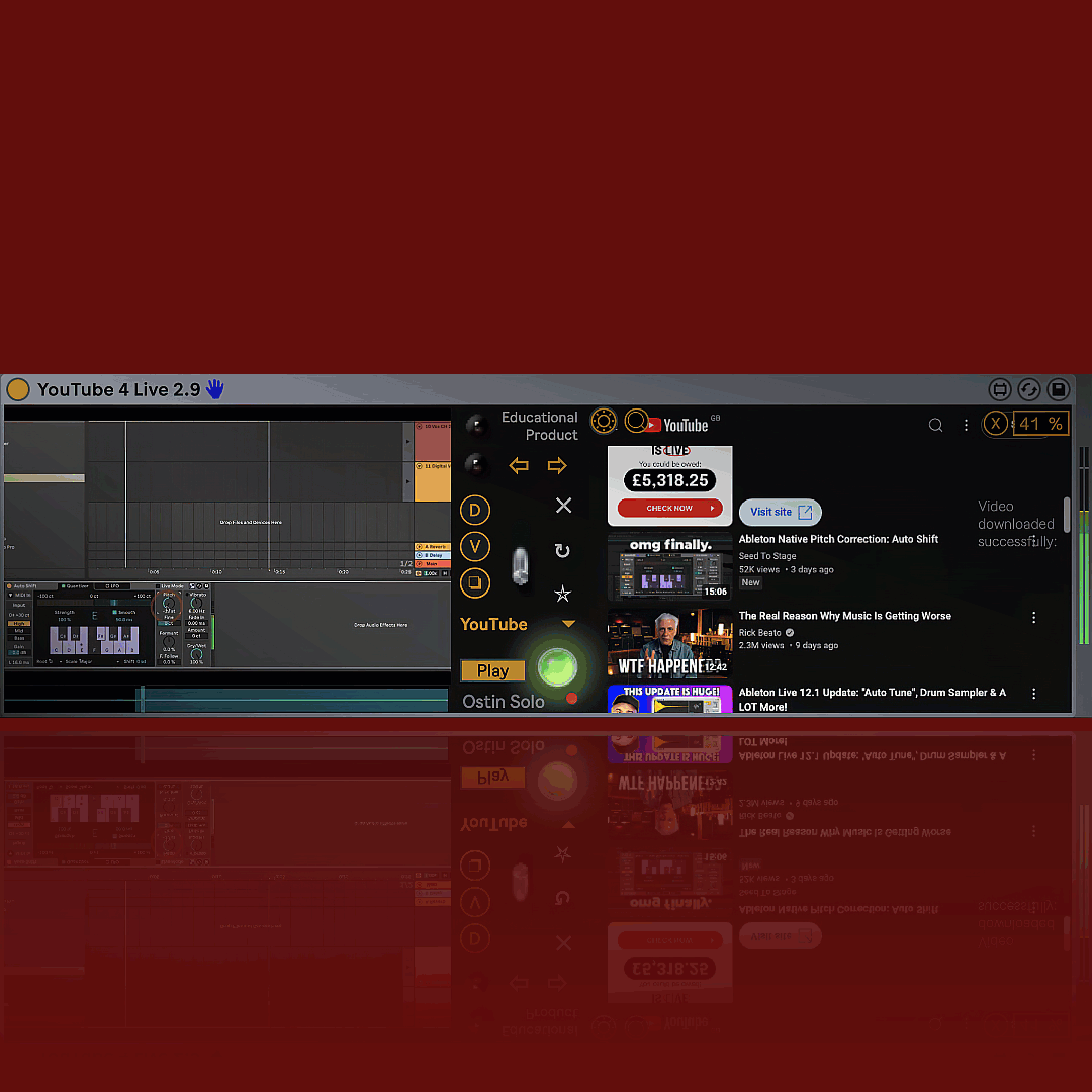 | Description: | Introducing YouTube 4 Live: A Max for Live Device for Seamless Web Integration and Audio Streaming in Ableton Live YouTube 4 Live is a meticulously designed Max for Live device that integrates web browsing and direct audio streaming from YouTube into the Ableton Live environment. This tool is designed to enhance the workflow of your music by eliminating the need to alternate between Ableton Live and an external web browser. Features: Integrated Web Browsing: Access web content directly within Ableton Live, enabling efficient multitasking and resource referencing without disrupting your creative flow. Direct YouTube Audio Streaming: Stream audio from YouTube videos straight into your Ableton Live projects, facilitating effortless, track analysis, and educational tutorial playback. Video also included. Variable Window Sizes: Tailored to fit various screen setups and user preferences, YouTube 4 Live offers adaptable window sizes, ensuring optimal visibility and convenience for audio analysis and web browsing. Streamlined Workflow: Designed to enhance productivity, YouTube 4 Live allows users to engage with online content and tutorials while maintaining an uninterrupted creative process within Ableton Live. Click the "D" and Drag and Drop the audio in your session by clicking on the video, it's never been so simple.... Click the "V" and Drag and Drop the Video in your arrangement. INSTALLATION GUIDE:------------------------------------------------- Ensure the VIDDLL package is installed on your system. I have included the package it should work out of the box. if not... https://www.youtube.com/watch?v=ElUaVieqWys https://www.youtube.com/watch?v=1HuMm0Nb4vw Complementary Workflow Enhancement: For an even more efficient production workflow, consider pairing YouTube 4 Live with Split Wizard Plus, further expanding your creative toolkit within Ableton Live. YouTube 4 Live is offering an elegant solution for integrating web-based resources and YouTube audio directly within Ableton Live. https://ostinsolo.gumroad.com/l/uudir IG: ostinsolo |