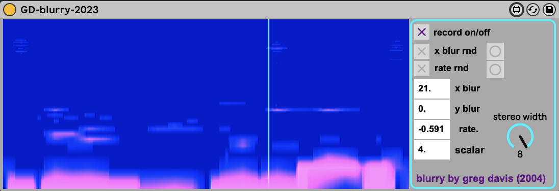 | Description: | gd-blurry is a Max For Live device that I originally created in the Max/MSP Pluggo environment around 2004 & updated for M4L in 2023. It captures incoming audio and applies a “spectral blur” effect. You can control the rate at which it scans through the buffer (forwards or backwards). You can also fine tune the amount and kind of blurring with the magnitude threshold, X-axis blur & Y-Axis blur. This is a fun one for smearing audio in different ways, I often use it with a slow rate setting around 0.25 or so. |