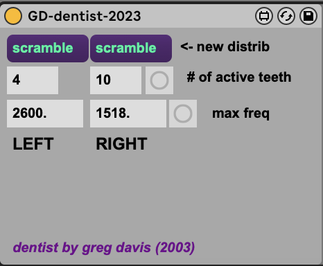 gd-dentist is a Max For Live device that I originally created in the Max/MSP Pluggo environment around 2003 & updated for M4L in 2023. It is a spectral spiky filter, that filters out partials or “teeth” from the input. You can choose how many teeth you’d like & the maximum frequency range for the filtering. There are buttons to randomize both of those values plus a button to redistribute the teeth. |