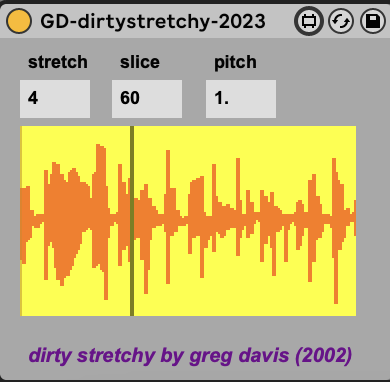 gd-dirtystretchy is a Max For Live device that I originally created in the Max/MSP Pluggo environment around 2002 & updated for M4L in 2023. It is a crude real-time time stretching effect. it records the incoming audio into a buffer and performs time stretching on it. You can control how fast or slow the time stretching is with “stretch” parameter. The slice parameter is basically how big of a slice of the audio that it scans through as its moving and pitch allows you to control pitch independently of time. |