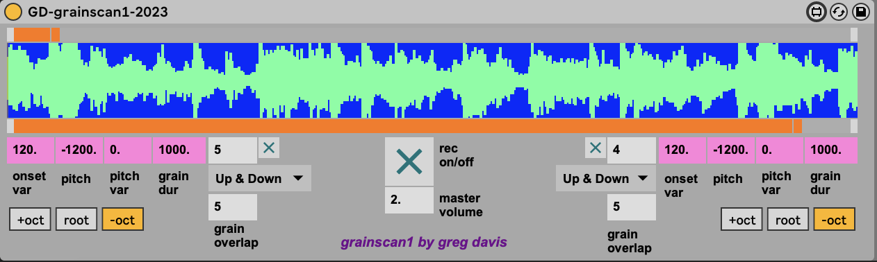 gd-grainscan1 is a Max For Live device that I originally created in the Max/MSP Pluggo environment around 2003 & updated for M4L in 2023. This is one of my favorite plugins that I’ve developed and I’ve used it in a lot of my older music. Incoming audio is recorded into a buffer and a granular synthesis effect scans through the buffer in real-time forwards and backwards. Independent controls for left / right side, many parameters to play with. At slower speeds, it creates a lovely drone / ambient cloud out of the original audio. Experiment and have fun! |