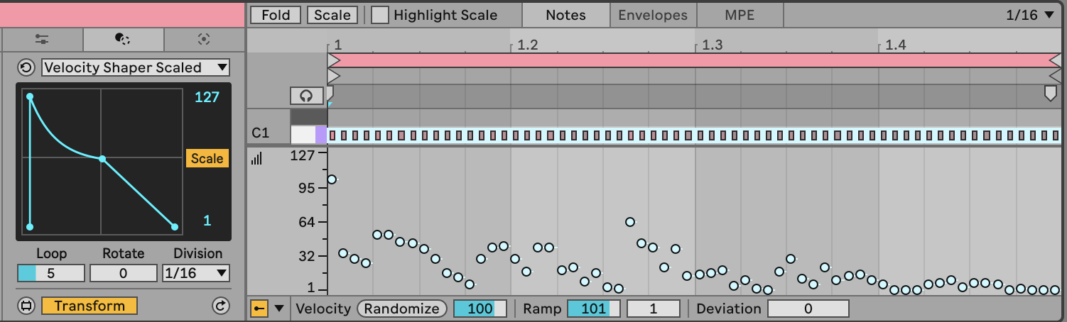 | Description: | Like the Ableton one but can scale the velocities as well as replace them |