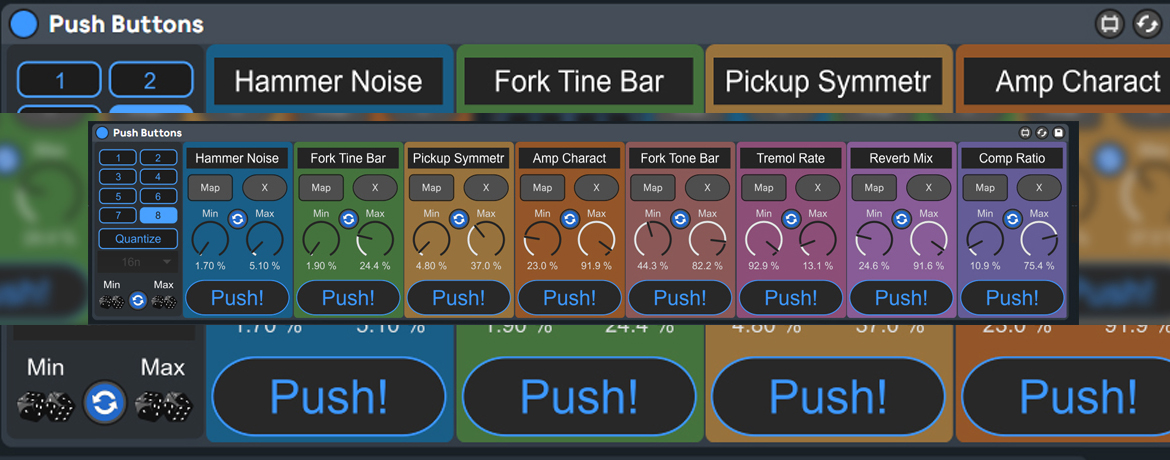 | Description: | Push Buttons is a small macro mapper where you can trigger a specific value of a dial in your Live Set with a button / toggle button. The idea is not new but very effective. Especially when working on screen, it's much easier and faster to push a button than to turn a dial knob... MAIN FEATURES: - Up to 8 mappers with min / max range and randomizer - Input quantization (Live transport must be aktive!) - As always a multicolored exterior Criticism, bug reports, suggestions, complaints, tips or whatever are always welcome! -> You need help? Contact me: metamagicum@gmx.de Or post a comment: https://maxforlive.com/profile/user/Metamagicum Push the button! Push Buttons: 1.0 tested on Windows 10 Tested Max Version: 8.3.1 / 8.5.6 / 8.6.4 Tested Ableton Live Version: 11.2.0 / 12.0.0 / 12.0.5 |