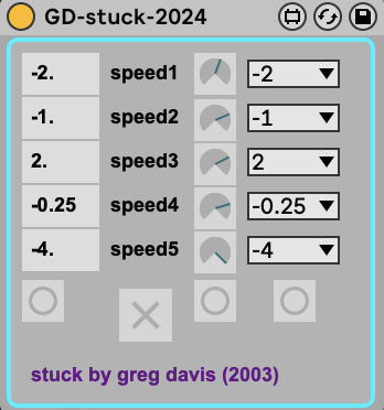gd-stuck is is a Max For Live device that I originally created in the Max/MSP Pluggo environment around 2003 & updated for M4L in 2024. This takes incoming audio and cycles recording it into 5 different short buffers to create a stuttering “stuck” effect. you can control the pitch and panning of each of the 5 voices. and there are some fun randomization controls at the bottom. |
