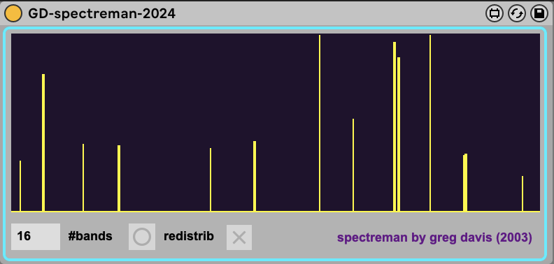 gd-spectreman is is a Max For Live device that I originally created in the Max/MSP Pluggo environment around 2003 & updated for M4L in 2024. This is a spectral filter with 250+ bands. You can choose how many bands you want to pass and then redistribute them randomly throughout the frequency range. or you can draw in the bands / frequencies you want. The toggle will randomize the bands triggered by the incoming audio. |