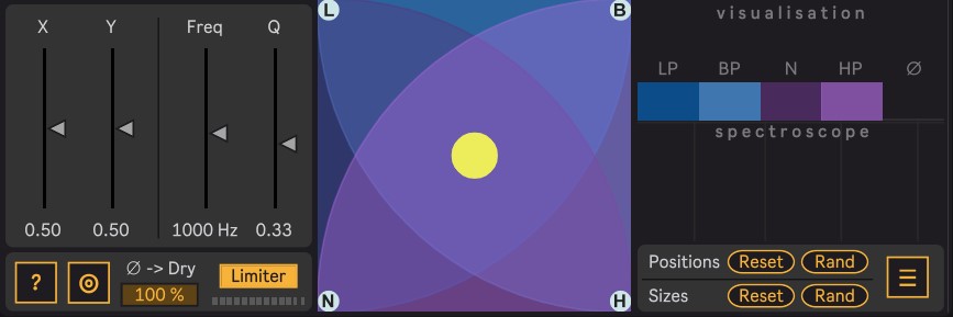 Morphilter lets you crossfade between 4 filter types. The filter types are represented as nodes on an XY pad. You can tweak or randomize the node positions / sizes to create new filter environments to mess around in.