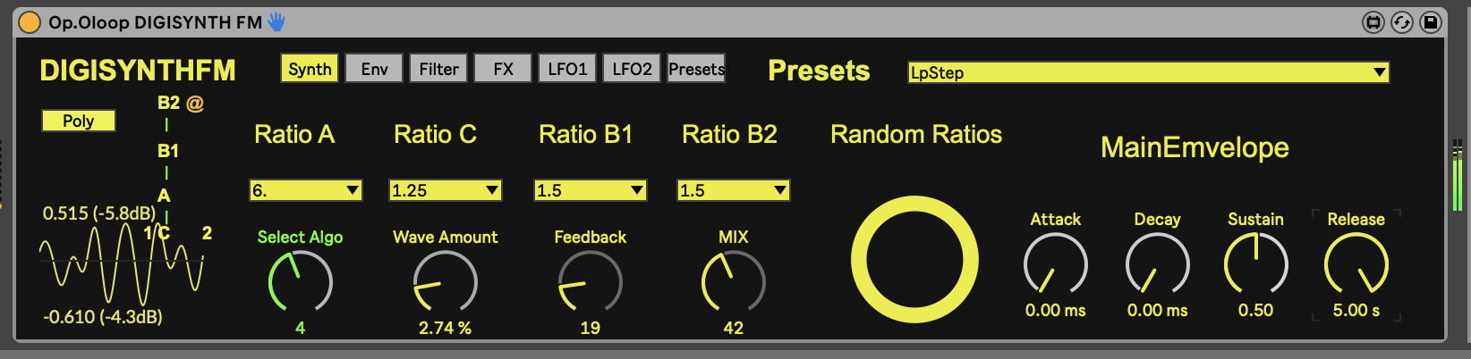 | Description: | The DIGISYNTHFM is a Fm synthesizer inspired on the "Digitone" Synth. It uses very similar configurations and algorythmics, but it is not the exact same, DIGISYNTHFM goes far away the limits of the Digitone algorhythms, it uses a one more modulator per voice scheme. After months trying different algorythmics schemes, we decided that adding a one more modulator works better for what we were looking for, and that is, weird FM synthesis!!! To check the Digitone Synth Manual here : https://www.manual.do/elektron/digitone/manual?p=90#google_vignette If you are familiar with the Elektron products then you will find this synth very easy to understand, if you are not familiarized with the Elektron Machines then you can read the manual of the Digittone and get an idea of what this is about. Of course, we did not make the sequencer part, it may be ridiculous to do it since all the capabilities of native Ableton and Max For LIve sequencers have to offer. This synthesizer will be in continuous development, adding more features, more presets, and better performance. and of course the upgrades will be for free for owners. For now, the DIGISYNTHFM has four fixed ratios, in the future, we will work on a system capable of giving to the user more flexibility, more subtle changes. In the FX area, we use the Bleep effects, courtesy of Beep. In the LFO area, we could go deep, but, again, it is nonsense to add more cpu processing when you can implement LFOs very easily in Ableton. We limited the amounts of LFO to 2. Lastly, the DIGISYNTHFM by Op.Oloop is a FM beast! Also, with the random function to apply to the ratios, it gives you tons of sound surprises, and modulating the Mix dial control with a soft sine wave, you have endless evolving sonorities. See : https://www.youtube.com/watch?v=nqwTjNR8Aro |