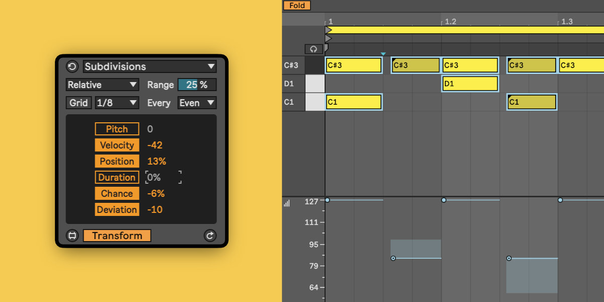 | Description: | Subdivisions is a Max for Live transformation MIDI tool for Ableton Live 12, designed for changing the properties of notes depending on their positions on the grid. It will only apply changes to notes with a starting time close to a chosen subdivision value, like 1/4, 1/8, 1/16, etc., and they can be the odd notes (on-beat), the even notes (off-beat) or both. The properties changes available are pitch, velocity, position, duration, chance and velocity deviation. They can be applied in Relative, Absolute or Randomize Modes. This MIDI tool can also delete, mute or unmute selected notes. Subdivisions is useful to add feel to MIDI clips, by having precise control of the separation between the on-beats and the off-beats (swing), and the dynamics between them. You can make a clip groove, accent certain notes, move the 2’s and 4’s ahead or behind the beat, quantize the starting and ending time of the notes separately, make two MIDI clips “play in the pocket”, and more. With MIDI clips on a loop, Subdivisions can apply chance and velocity deviation only to the off-beats for example, leaving the on-beats without changes or with different values. |
