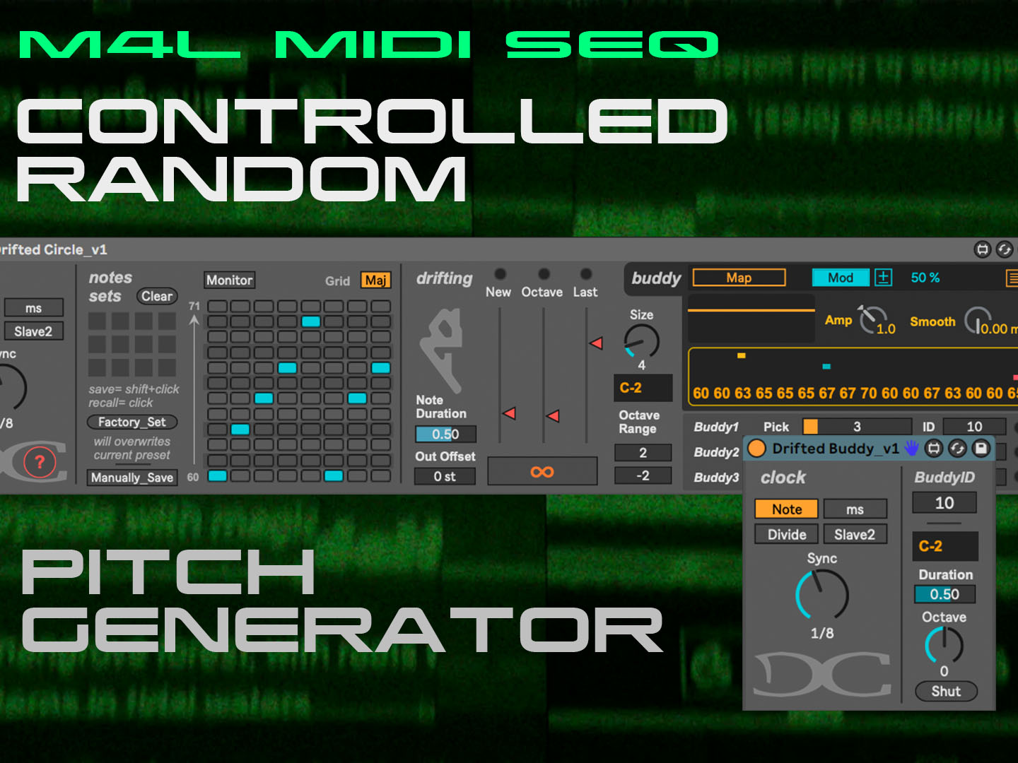 | Description: | Drifted Circle (DC) is a controlled random pitch sequencer based on the shift register principle, ideal for use as a melody generator, phrase catcher, parametric sequencer. Used in conjunction with the Drifted Buddy, it can be used to generate highly musical polyrhythmic melodies. Unlike shift registers such as the Turing Machine, DC does not move binary bits, but rather specific pitches within a selected range, making it easier to generate controlled, musical melodies. The core principle of Drifting: Simply put, you first need to select 8 pitches within an octave (Notes Set), the DC will randomly select one of these pitches to play and store it into Register, the notes in the Register move to the right one by one as new notes are added. New notes are generated in three ways: 1 - Last: fetches the Xth step in the register, X is determined by Size. 2 - Octave: fetches the Xth step in the register and generates a random octave change, the Octave Range determines the range of the octave change. 3 - New: continues with the pitch selection from the Notes Set. You can determine the percentage probability of these three situations occurring by using the faders corresponding to Last, Octave, and New. When ∞ is turned on, the DC forces the Last mode regardless of the probability ratio, which creates a constant loop, the length of this loop is determined by Size. Demo video: https://youtu.be/AIsa0HZ-hnU?si=Mf5V-xHXnhGrmwWa |