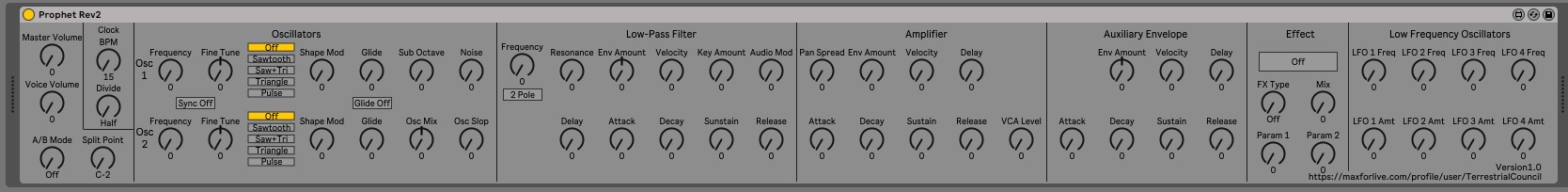 | Description: | Full MIDI control of your Sequential Prophet Rev2. Features: -All useful parameters fully controllable within Ableton just like the stock synths -Correct scaling of parameters in the automation lane -NRPN parameters (where applicable) are used for the finest possible control Caveat: Due to MIDI spec limitations, you should limit to controlling 3-4 parameters at once, to ensure all the data is sent to the synth. If you like this device feel free to donate by buying one of my albums (the older ones are pay what you can): https://terrestrialcouncil.bandcamp.com/ |