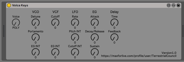 | Description: | Full MIDI control of your Korg Volca Keys. Features: -All useful parameters fully controllable within Ableton just like the stock synths -Correct scaling of parameters in the automation lane Caveat: Due to MIDI spec limitations, you should limit to controlling 3-4 parameters at once, to ensure all the data is sent to the synth. If you like this device feel free to donate by buying one of my albums (the older ones are pay what you can): https://terrestrialcouncil.bandcamp.com/ |
