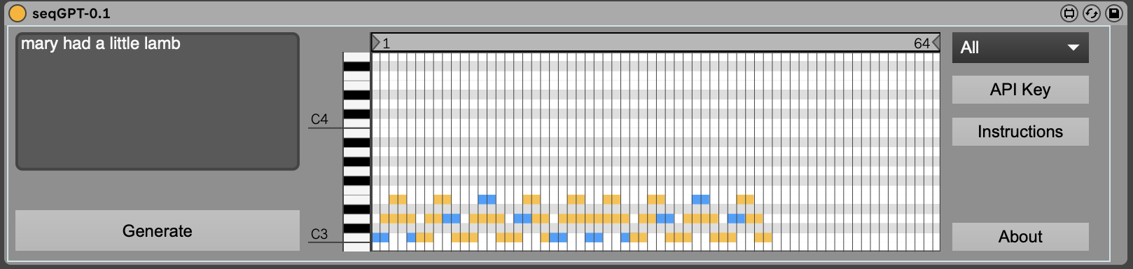 | Description: | Enter a text prompt and get a midi sequence generated by openAI. Keywords: chatgpt generative ai gpt4o prompt chat sequencer |