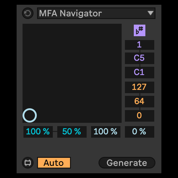 | Description: | Navigator enables intuitive exploration of an endless pool of possible MIDI patterns via a simple XY field. The vertical axis controls the variety of note pitches and velocities explored within the ranges defined at right, with increasing variety at higher values, while the horizontal axis controls the density of the pattern and the variety of note lengths as specified by the sliders at bottom. Density always increases going right, pitch range always expands going up - but horizontal note length and vertical velocity ranges can be inverted. Velocity deviation and overall note probability can be set for all output globally. Increase the number slider below the scale awareness toggle to add up to six polyphonic voices within the note range. At bottom left, patterns will be more simple and sparse, at upper right they will be busiest and most complex. Info View Annotated: Learn all you need to know directly in Live - just open the Info View and hover your mouse over any parameter. Scale Aware: Natively integrated with Live 12's scale and key for seamless workflow. Theme Adaptive: Device colors automatically adapt to your preferred Live theme. Already comes included with MIDI Toolset 002. Requires Live 12 running Max 8.6.x |
